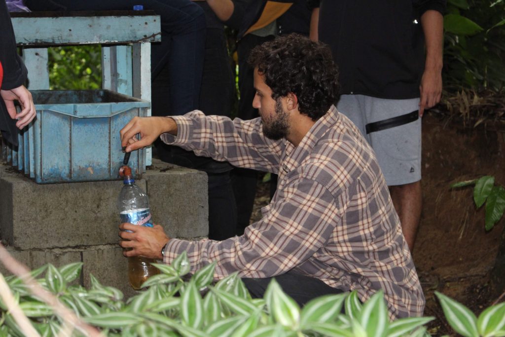 As minhocas se alimentam desses resíduos e produzem este líquido. Após alguns meses, o biofertilizante é retirado da última caixa e utilizado para nutrir o solo! Na Estação de Educação Ambiental do NIMA, garrafas como essa saem cheias desse adubo e servem para fertilizar os canteiros da PUC e as nossas hortas!