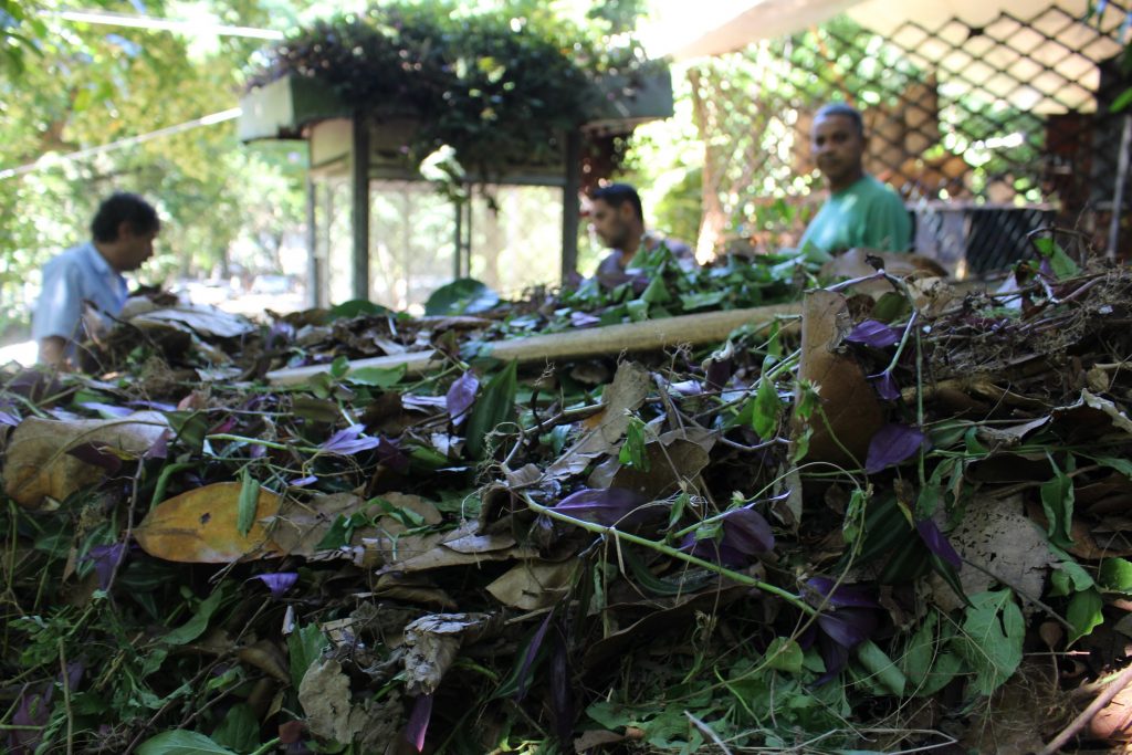 Após 3, 4 ou até 5 meses de composição, é realizada a desmontagem. Colhe-se a matéria orgânica, que é usada nas hortas e o excedente vai para os jardins da universidade.
